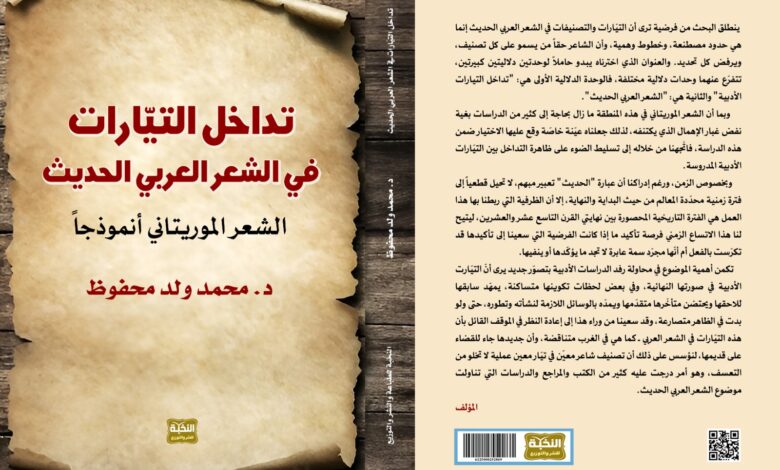 صدر حديثًا عن دار النخبة للنشر والطباعة والتوزيع، كتاب «تداخل التيارات في الشعر العربي الحديث – الشعر الموريتاني أنموذجًا»، للباحث والشاعر والناقد الموريتاني الدكتور محمد ولد محفوظ، في عمل علمي يسعى إلى إعادة قراءة المشهد الشعري الحديث من زاوية مغايرة، تكسر التصنيفات التقليدية وتعيد مساءلة الحدود الفاصلة بين التيارات الأدبية.